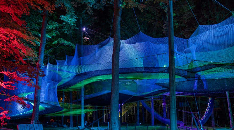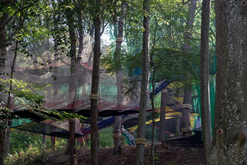 Comparés à tort aux accrobranches, les Parcabout® sont d'immenses sculptures en filets suspendues dans les arbres (ou mises en place sur des poteaux) dans lesquelles chacun peut circuler librement en toute sécurité.