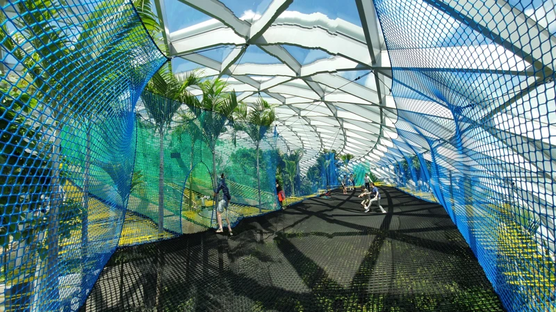 Le concept du Parcabout® est d'utiliser les matériaux et techniques du monde maritime pour réaliser de grands parcs de loisirs suspendus.